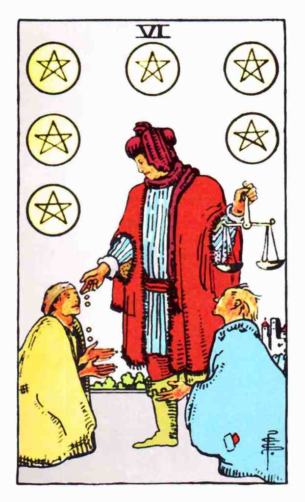 The Six of Pentacles embodies all it means to be giving. Being charitable is seen by most as a part of good character. Consider Robin Hood. Because he gave to the poor, he was considered rich in spirit regardless of other character flaws.