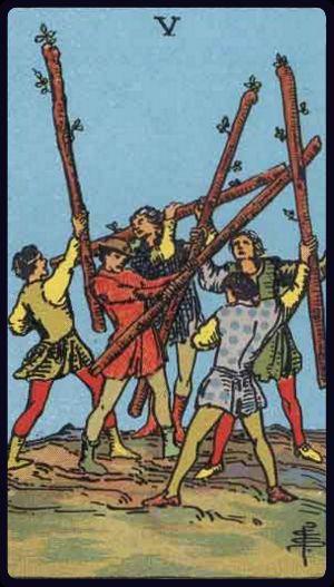 The Five of Wands is the ‘Hunger Games’ of Tarot. If this Minor Arcana card appears in your Tarot reading, prepare for some stiff competition.